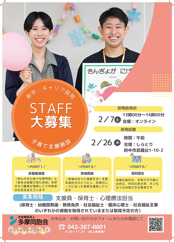 | 職種 | 支援員・保育士・心理療法担当 若干名 |
