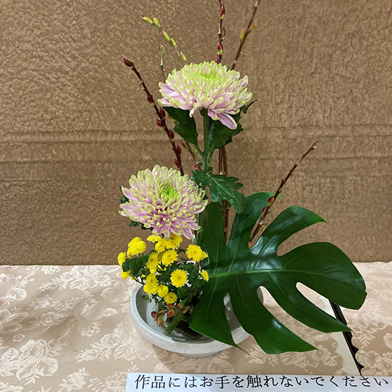 正面玄関入ってすぐに、養護ご入居者の活け花を展示しています。とても鮮やかで素敵な作品です。御覧ください。