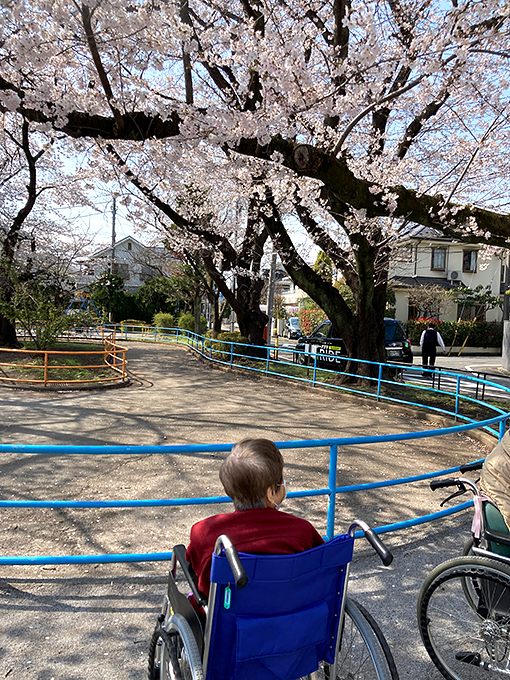 風もなく、やわらかな日差しが差し込む午後。特養のご利用者さま・ご家族さま・職員で、近くの公園へお花見散歩に出かけました。