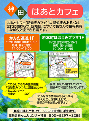 神田はあとカフェは、認知症のある・なしや世代に関わらず、 「認知症」について皆さんで情報共有しながら交流できる場です。
