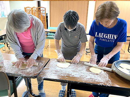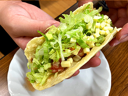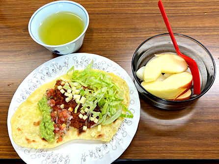 今回はメキシコ料理のチリコンカンをお楽しみいただきました。参加者のみなさんにもトルティーヤ(生地)を伸ばしていただき、チリコンカン、アボカドディップ、チーズ、レタス、サルサを巻いてタコスの出来上がりです!