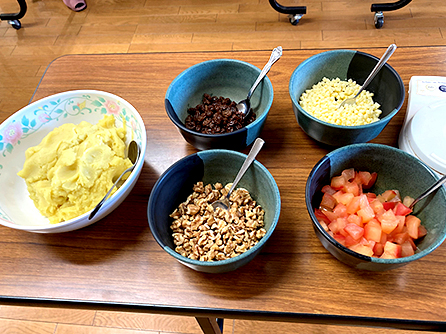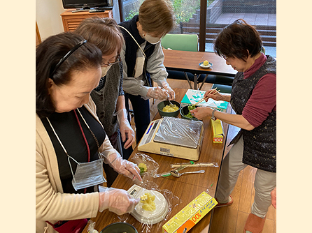 今回は参加者のみなさんと一緒にさつまいも茶巾を作りました。ひとつはプレーンと抹茶の二色、もうひとつはプレーンにお好みの具(煮リンゴ、クルミ、レーズン、チーズ)を入れて作ってみました!